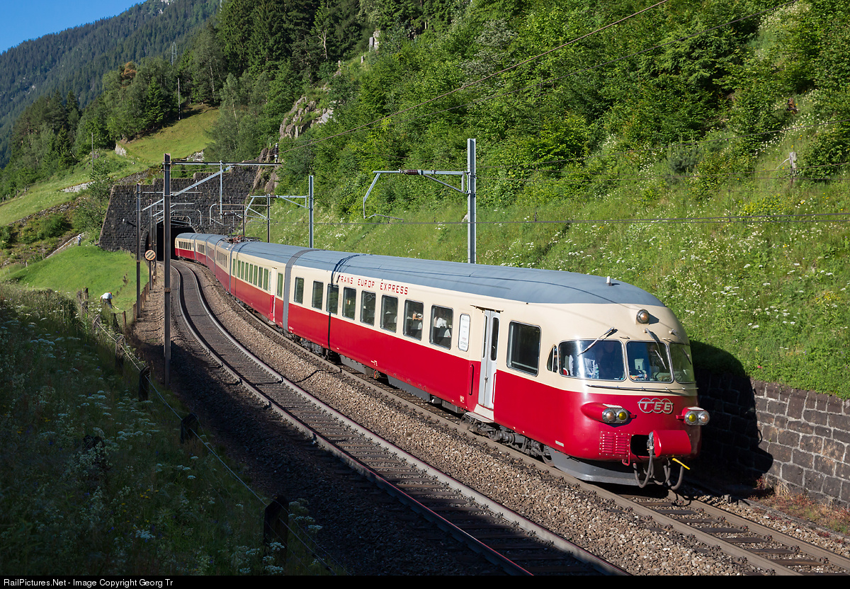 | The timeless elegant RAe TEE II # 1053 TRANS EUROP EXPRESS trainset from 1961, now running for SBB Historic, is on a charter journey from Bellinzona to Yverdon-les-Bains, running on the uppermost level of the loops at Wassen, on the Gotthard north ramp. In the background the 103 meter long upper Entschigtal avalanche protector. |