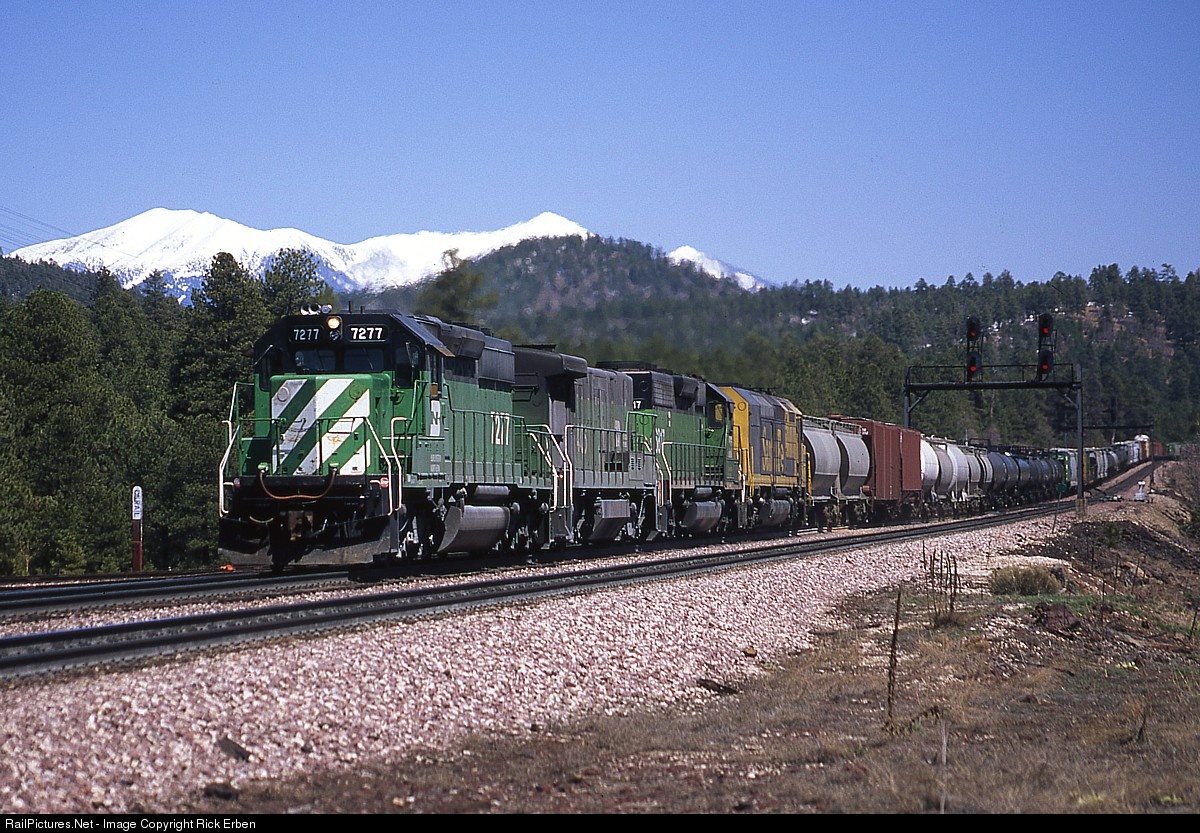 BN 7277, 4045, 6817 and ATSF 5261 hustle 86 cars of Barstow-bound manifest across the Arizona Divide on a Sunday afternoon with one of those appealing early post-merger power consists including two BN SD-40-2s, a BN B-30-7 B unit and a Santa Fe SDF-40-2. Many of us miss those classic Santa Fe signals; these at Maine dating to early 1961 after completion of the Crookton Cut-off as CTC was extended eastward. Fuji Velvia.