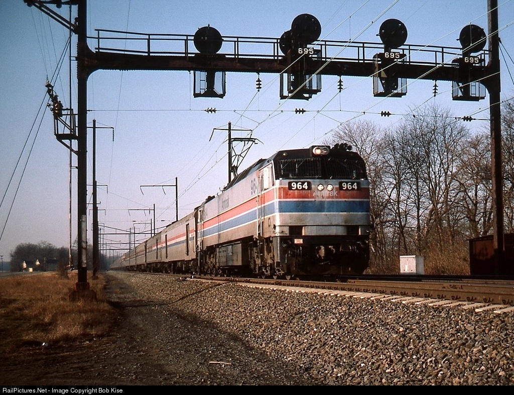 The now-preserved 964 (at Strasburg, PA) is pulling a heavy northbound train of Heritage equipment under the classic PRR position light signals between CP BUSH and Perryman. The 964 was built by GE for Amtrak in June of 1976, and was later renumbered to 603 when Amtrak rebuilt it in the late 1980s. It was delivered to the RR Museum of PA in January, 2004.