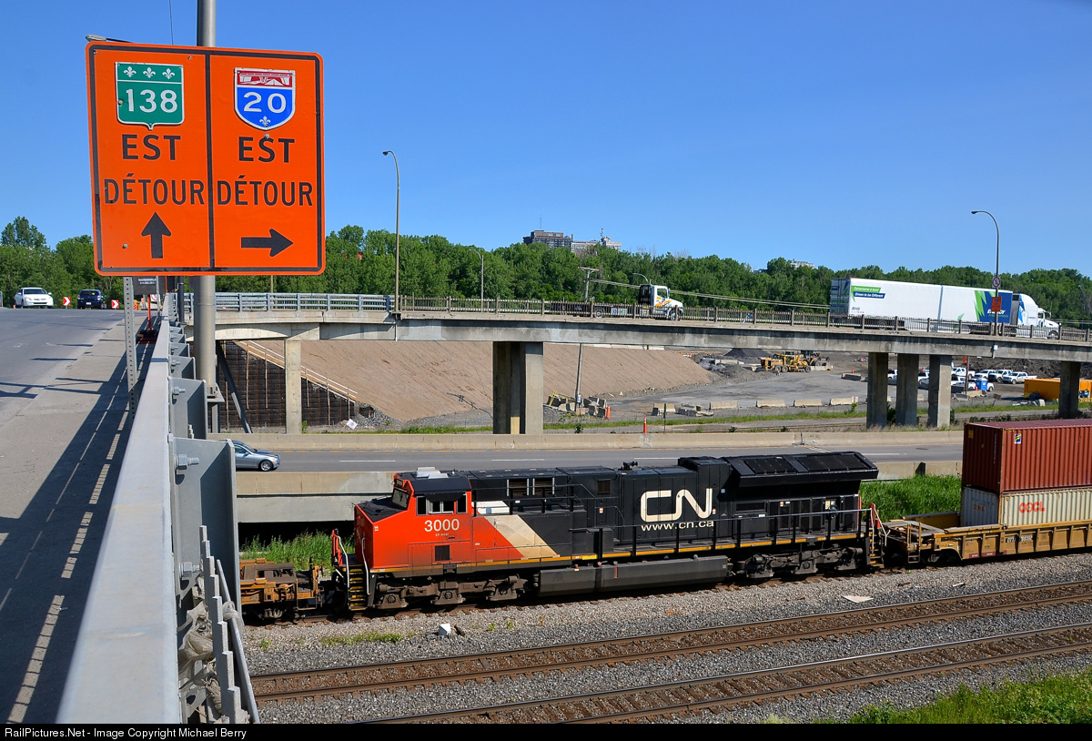 | Class leader DPU. CN 3000, CN's first ET44AC, is temporarily stopped by the Angrignon overpass in Motnreal. It is serving as the DPU of CN 120. |