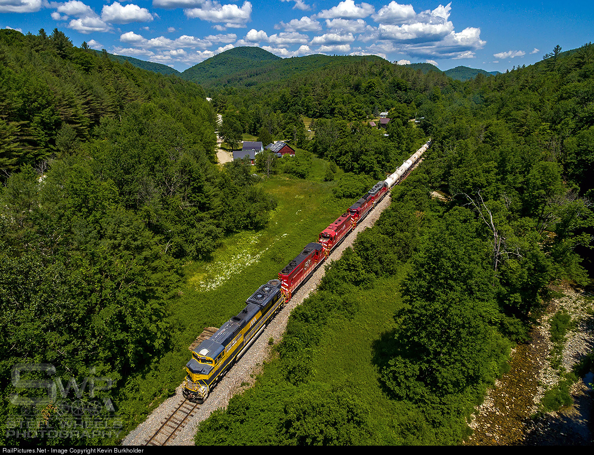 Vermont Rail System recently moved some of the Pan Am Southern Railroad interchange back to Bellows Falls, Vermont, including the weekly limestone slurry train from the OMYA quarries in Florence, VT to Pan Am Railway for movement to Portland, Maine and the remaining paper mills north of Portland. On Saturday, June 25, running as GMRC 263X-25, the 55-car slurry train exits the Cavendish Gore on its way into Gassetts, VT with VTR SD70M-2 432, GP40-2W 311, GP40-2 308, GP38-2 201 and GP38-2 206.