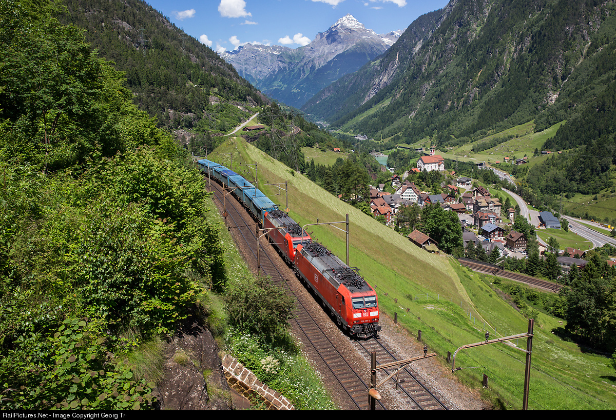 | Two 185 locomotives (Bombardier TRAXX) of DB AG are pulling a southbound freight up the Gotthard north ramp on the uppermost level of the loops at Wassen, with the tracks on the middle level down on the right and the village, church and the Chli Windgällen mountain in the background. |