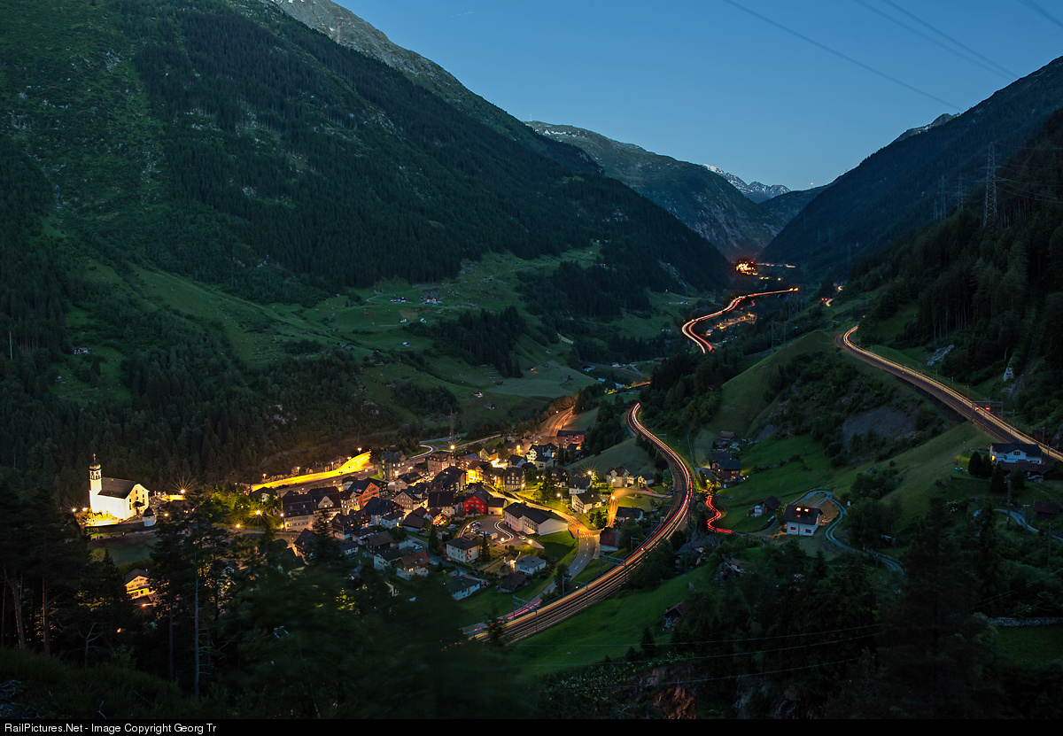The upper Reuss valley in the blue hour at 10.18 PM, in a multiple long time exposure. In the foreground the village of Wassen, junction to the Susten pass, in the background the lights of Göschenen and the Schöllenen gorge. The broad light traces in the valley are from vehicles on the Gotthard highway A2. On the right, on the mountainside, we can see the light traces of the northbound Interregio 2442, far away near Göschenen, in the Eggwald part (clearly visible the two red signals of Eggwald track change station) and between the upper Entschigtal avalanche protector and the former linesman house number 23fs on the far right. In the middle, the light traces on the middle level of the loops, between Middle Meienreuss bridge and the lower Entschigtal avalanche protector. The train changed from the left to the right track on the switches before Wassen station. On the left the baroque church of Wassen, built from 1734 to 1742, on a hill. When travelling over the Gotthard line, you can see this church from three different levels.