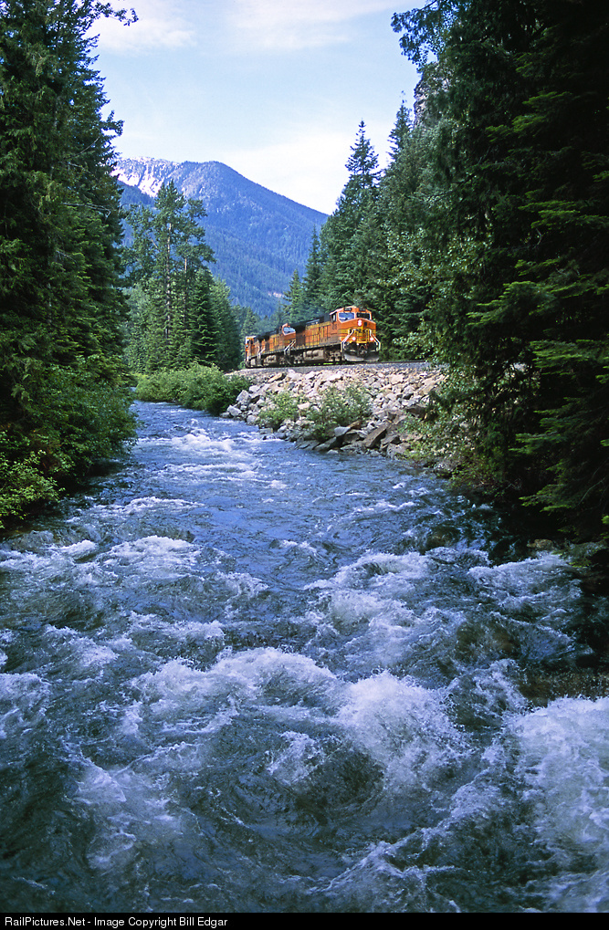 | BNSF 4518 has an eastbound Z train under control as it descends Stevens Pass along Nason Creek about a mile from Merritt, WA. The grade will level out somewhat at Merritt along faster speeds down the Chumstick cutoff and Wenatchee River valley into Wenatchee. |