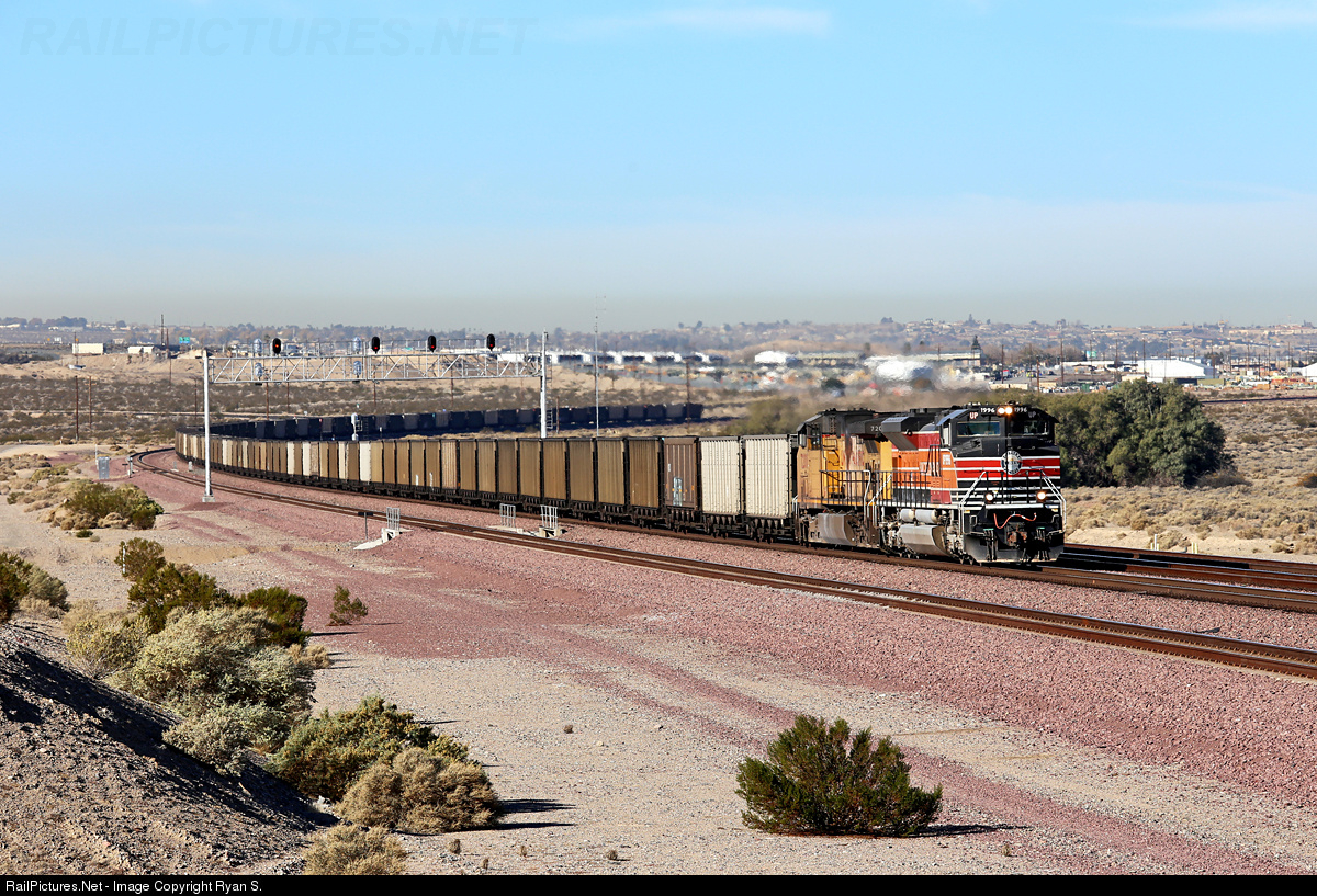 | Union Pacific's eastbound empty Trona coal buckets roll through Nebo (West Daggett) on BNSF's Needles Subdivision with a clean UP 1996 (Southern Pacific heritage) as its lead motor. The train, exercising trackage rights over BNSF rails since leaving Mojave, will be on home rails shortly as Union Pacific's Los Angeles & Salt Lake route diverges off the former Santa Fe at Daggett, CA. Once back on home rails the Trona buckets will take the LA&SL to a Utah coal mine for another load. |