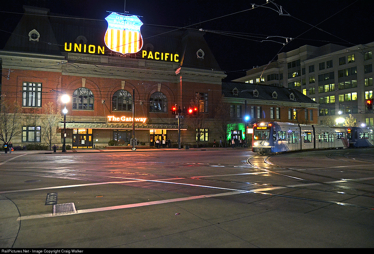A Green Line train heading to the West Valley Central terminus on March 13th, 2015. As it approaches the Arena Station, it passes the venerable old Union Pacific passenger station. Built in 1908-1909, the UP station served that railroad until the advent of Amtrak in 1971. Later, Amtrak utilized this station from 1976 (when the Pioneer began service) until 1986. Beginning in 1983, it also began playing host to Amtrak's California Zephyr and the Desert Wind as well, until they moved in 1986 to the old Rio Grande station, just south of the UP's station. One hundred years after construction began on the station, the Utah Rail Authority built their light rail system's Blue Line extension to the Salt Lake City Intermodal Hub, providing a nice contrast between early 20th Century design and early 21st Century technology. The station is now part of a shopping mall.
