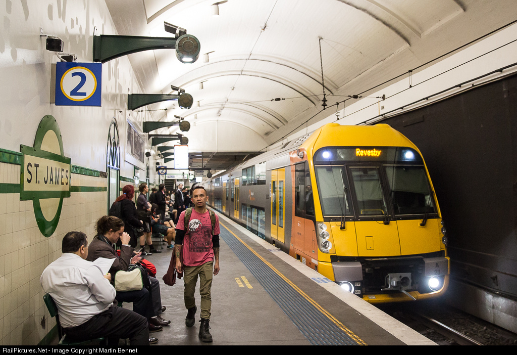 A 'Waratah' subruban EMU set arrives at St. James, on Sydney's underground City Circle. This part of the underground opened in 1926.