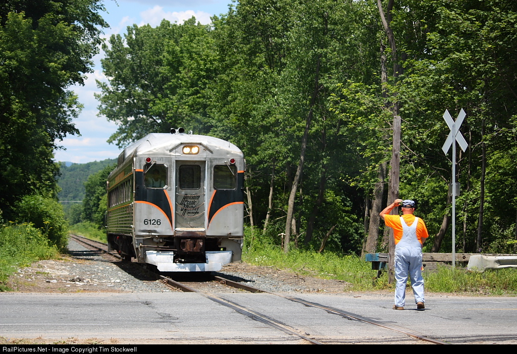 | The conductor for Berkshire Scenic Railway's 1:00 PM Hoosac Valley Service train flags Hodges Crossing as former B&M Budd RDC #6126 approaches. The Berkshire Scenic's Hoosac Valley Service operates on the former B&M Adams Branch (originally NYC) between North Adams, MA and Adams, MA. This branch also still sees freight service by Pan Am Southern. |