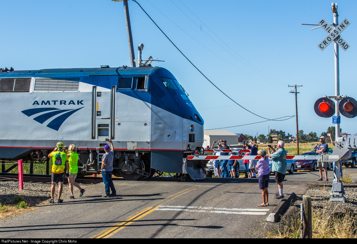 | On California Northern rails, the NASCAR Special to Sonoma Raceway passes through a small community along the Napa River at a blistering 10 MPH. Local folks turn out to watch the train pass. This is the only passenger service to use these rails all year. |
