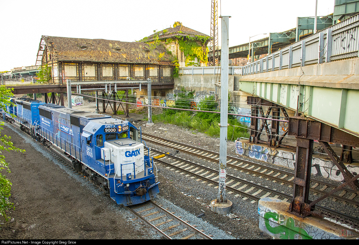 | "GMTX 9000 at Westchester Ave Station" GMTX SD60 #9000 leads Providence & Worcester FPCH (Fresh Pond/ Cedar Hill) stone train east past the abandoned NYW&B Westchester Ave Station on Amtrak's Hell Gate Line. GATX #9000 was jointly leased by Providence & Worcester and Vermont Rail System and features a specially made logo representing both railroads on the sides. Westchester Ave Staion was designed by Cass Gilbert & completed using terra cotta detailing in 1908. Service ceased in 1937, but due to the way the station was constructed, it still remains today, suspended over Amtrak's Hell Gate Line (Northeast East Corridor). Also noticeable in this photo is the missing track from the CSX Secondary. CSX replaced the first secondary track with steal ties and is now working on doing the same with the second track which is fully removed in the photo. |