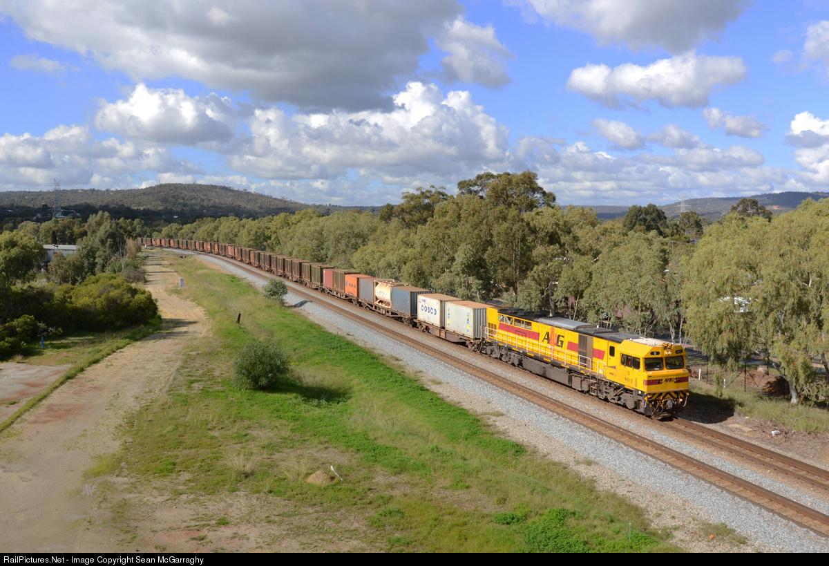 | Having been caught up in the Avon Valley near Moondyne for a good hour or so, a late running 3430 empty sulphur containers from Malcolm rolls round into Bellevue behind Q4012. This train would go on to lose more time once it got to Forrestfield due to a locomotive swap before continuing through to Kwinana. |