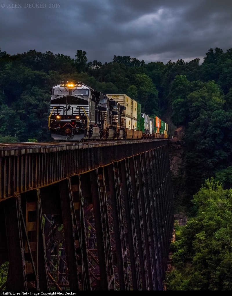 As storms start to brew to the south, a brand new ET44AC leads NS 204 across the 1911 build trestle over the James River in Lynchburg.