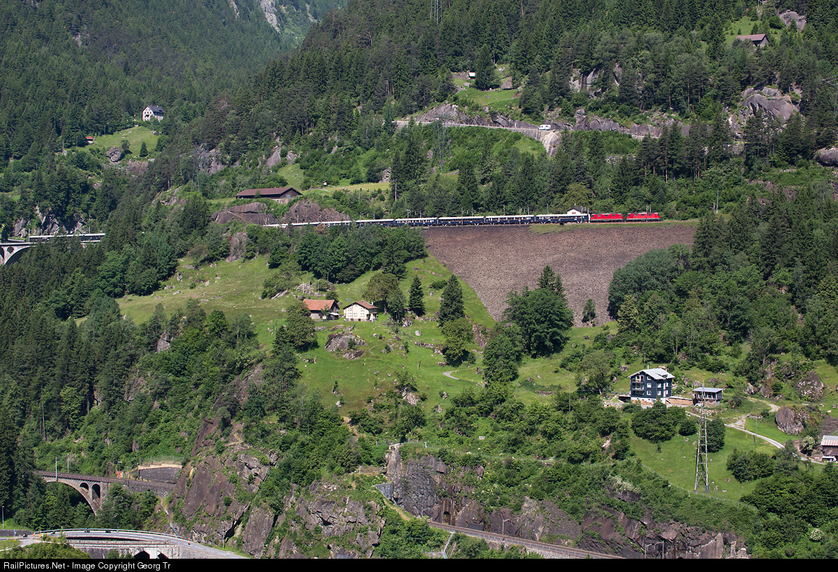 | The luxurious Venice Simplon-Orient-Express with 17 cars is pulled by two Re 4/4 II of the SBB, running on the middle level of the loops at Wassen (on the left the middle Meienreuss bridge). Below is the lowest lewel of the loops with the lower Meienreuss bridge. |