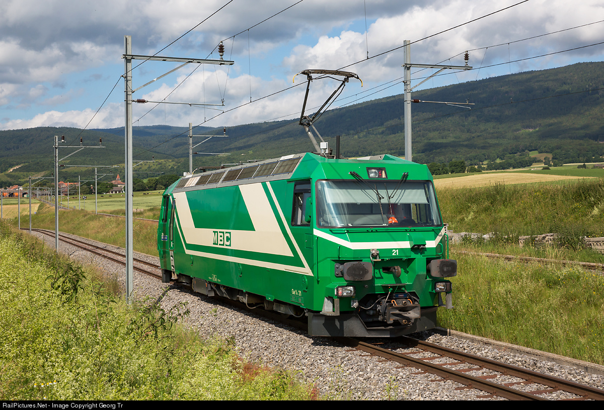 1 meter gauge locomotive Ge 4/4 # 21 "La Morges" of the MBC, built in 1994 by SLM and ABB with 2400 kW, for freight service, mostly for heavy military trains to and from the training area near Bière.