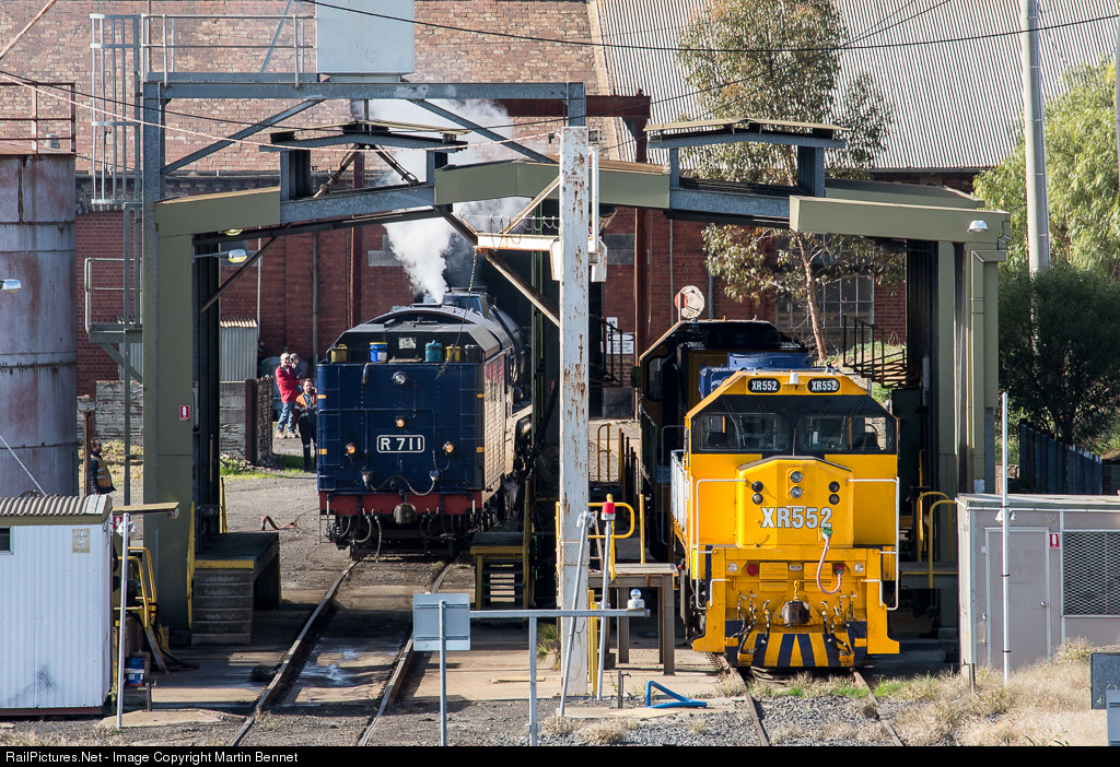 | XR552 (rebuilt in 2003 from X40, built 1970) rests with another XR at the Bendigo fuel point. 4-6-4 Hudson R711 is rolling towards the roundhouse to be turned. Bendigo is the only remaining location in Victoria with an indoor turntable. |