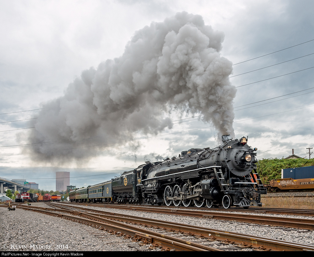 Running wind sprints. Doing photo run-bys with Spokane, Portland & Seattle #700 in the Portland Yard is a bit like taking an Indy Car to the drag races. We've got a machine that was built for sustained high speeds, but we have perhaps a half mile of track in which to simulate a high speed run. It sounds like a difficult proposition, but on this day, Engineer Jim Abney and Fireman Jeff Honeyman make it look easy. With a consist of just 3 heavyweight passenger coaches, the mighty 700 goes from a standing start to an undisclosed but impressive top speed in just a few hundred yards, and shutting down almost as quickly after the last car has passed the photo line. After spending an afternoon and evening watching this gal run these "wind sprints", just about everyone on this 2014 Lerro Productions Charter was hungry for a mainline charter with this beauty, where she could truly stretch her legs. Alas, we will all have to wait a while for that. The 700's FRA Form 4 recently expired and she needs a 1,472-day inspection to get recertified for another 15 years. That inspection has been started, and the Pacific Railroad Preservation Association has the manpower and expertise to do it, but they need some help financially to make it happen.