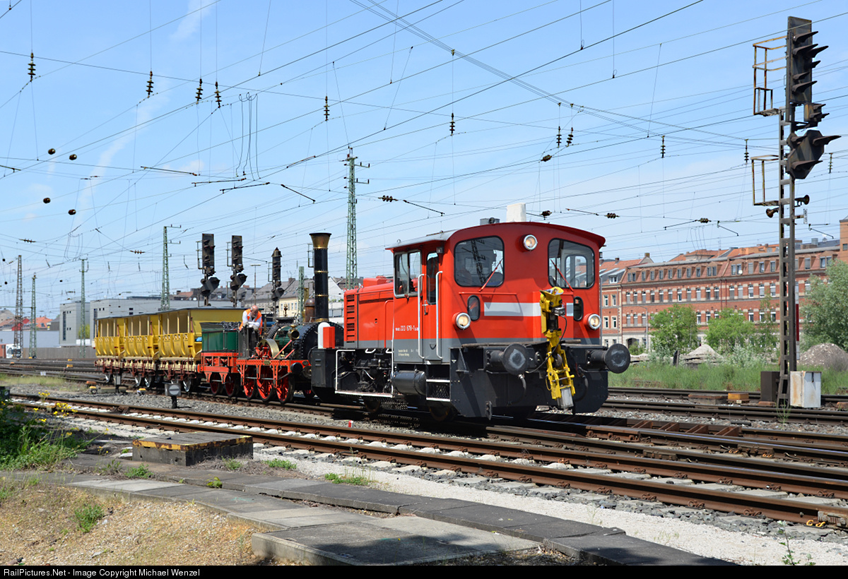 With a maximum speed of 20 km/h -most of the time slower- and several stops to check and let cool a little bit the hot driving axle box the "Adler" is towed to the railshop of the Nuremberg shunting Yard by the shunter of DB Museum.