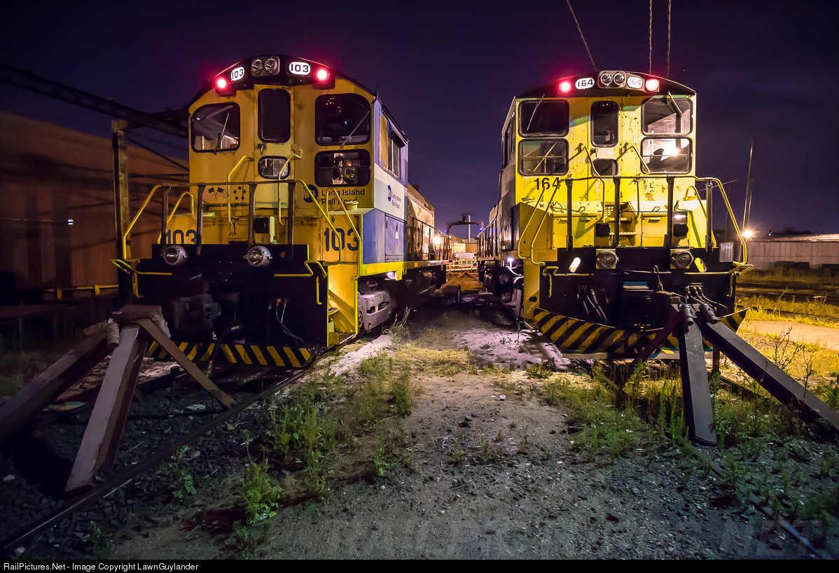 | LI #103 and #164 idle away the humid evening before the night shift workers come in to inspect and load box them. The 103 works primarily within the Richmond Hill passenger yard, shunting coaches and engines, while the bigger and more powerful 164 handles road duties due to its cab signaling and higher horsepower. |