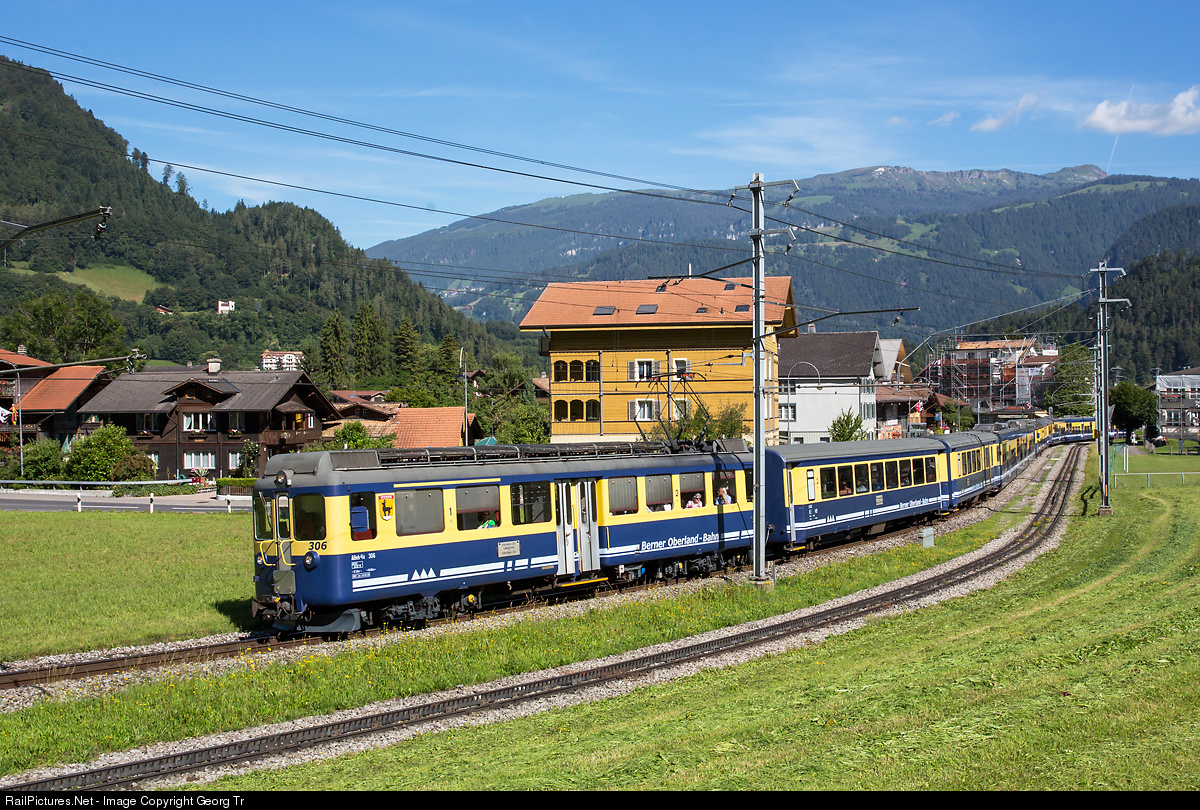 1 meter gauge adhesion/cogwheel railcar ABeh 4/4 # 306 "Lütschental" of the BOB with train 149 from Interlaken Ost to Zweilütschinen, from where this front part of the train will head for Lauterbrunnen. The rear part of this long train, pulled by railcar ABeh 4/4 # 304 "Bern", will run to Grindelwald. Both railcars were built in 1965 by SIG, SLM and BBC.