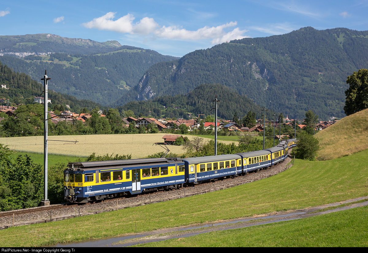 | 1 meter gauge adhesion/cogwheel railcar ABeh 4/4 II # 312 "Interlaken" of the BOB with train 151 from Interlaken Ost to Zweilütschinen, from where this front part of the train will head for Lauterbrunnen. The rear part of this long train, pulled by railcar ABeh 4/4 II # 313 "Lauterbrunnen", will run to Grindelwald. Both railcars with 1256 kW were built in 1986 by SLM and BBC. The train was formed as follows: ABeh 4/4 II # 312-A # 182-B # 252-cab car BDt # 40.-articulated cab car ABt # 421-ABeh 4/4 # 313-BD # 503-BDt # 40.-ABt # 425. |