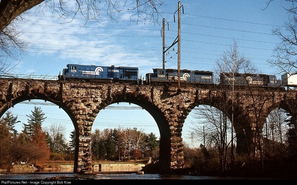 A big GE B36-7 leads two Geeps and an intermodal train westbound over the Conestoga River. Note the staggered stonework in the arches. When built, there was provision made for doubling the width of the bridge to four tracks at some point in the future, which was never done. The staggered stones would have interlocked with the "new half" of the bridge.