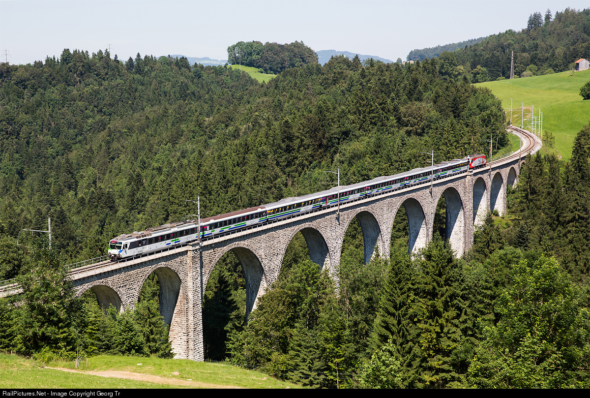 "Voralpen Express" (VAE) 2580 from St.Gallen to Luzern (this day to Arth Goldau only because of track work) is crossing the 282 meter long Weissenbach vaiduct of the former Bodensee-Toggenburg Bahn (BT), now the Südostbahn line (Romanshorn-) St.Gallen-Wattwil. Since a few days, the power of the train is very special and rare, with railcar RBDe 561 # 082 in front and locomotive Re 446 # 016 in the rear. Usually there are RBDe 561/Re 456/Re 446 in front and rear, but not mixed.