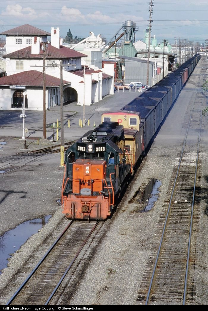 WP GP35 3013 pulls a loaded train of export coal past the Stockton Amtrak depot on the Santa Fe toward the Port of Stockton.