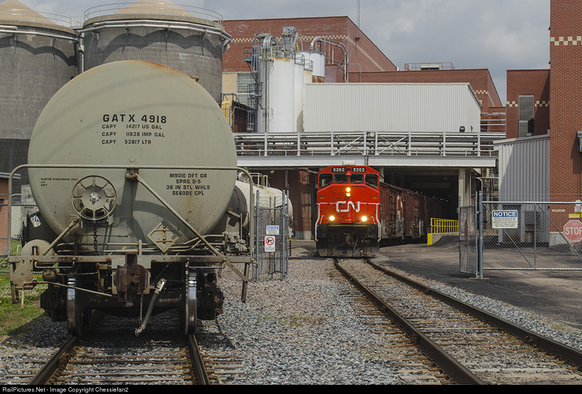 | On the banks of the Wisconsin River, Canadian National SD40-2W 5262 switches the New Page paper mill in Stevens Point, WI. |