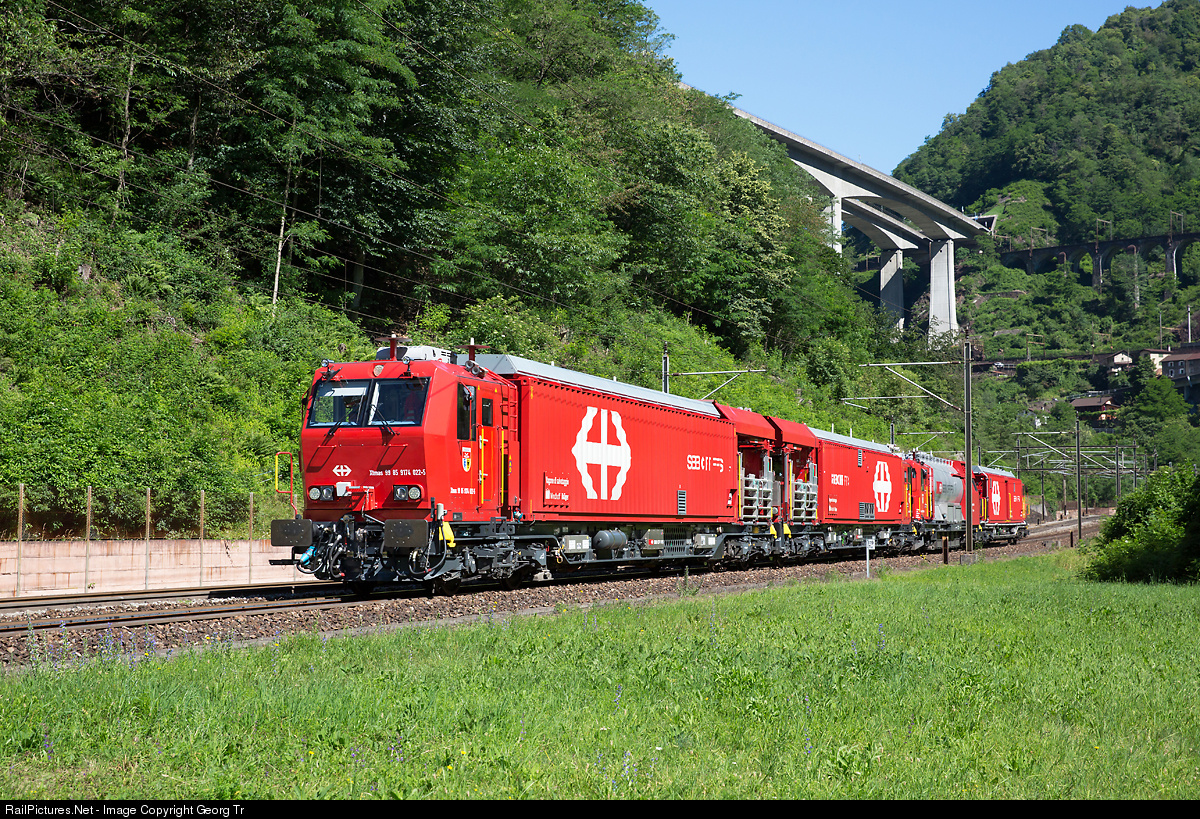 Fire fighting and rescue train "LRZ 14" (Lösch- und Rettungszug Baujahr 2014) Xtmas 9174 022 with name and blazon of "Biasca". For the Gotthard line including the new Base Tunnel, such trains are based in Biasca and Erstfeld. Leading is the rescue unit, followed by a second rescue unit, then the not self propelled tank car (with 48000 liter/12680 gal. water) and the equipment unit in the rear. The train is on a practise run from Airolo over the Gotthard south ramp back to Biasca, on the lowest level of the Biaschina "staircase".