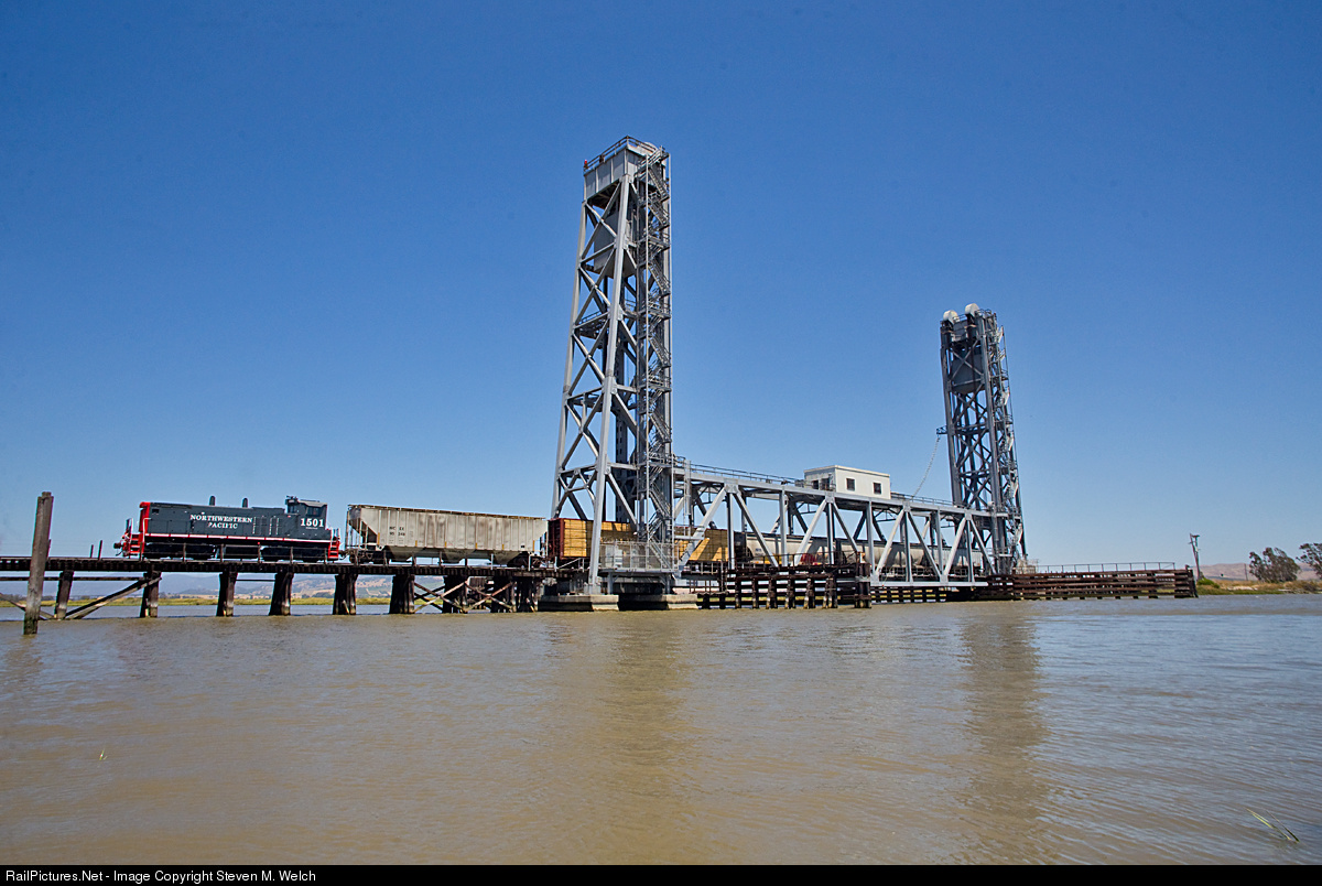 | Crossing the Napa River on the famed Brazos drawbridge, newly acquired Northwestern Pacific MP15 NWP 1501 leads a short train on a rare Wednesday run home from the California Northern at Lombard. The 1501 began life as SP 2694 and later lived as a yoUPee and later GMTX unit before purchase by the NWPCo. |