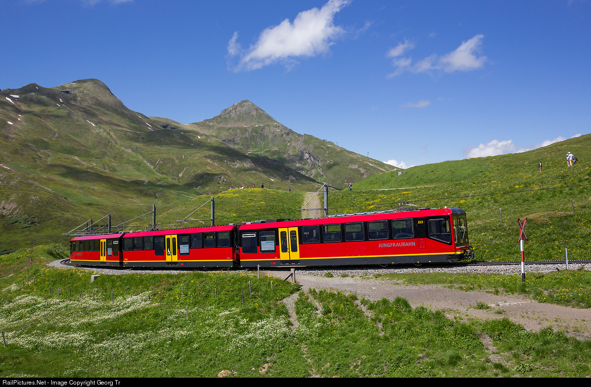 Brand new articulated, partly lowfloor, cogwheel train Bhe 4/8 # 223 from Stadler Rail, not in service yet, but making brake test runs between Kleine Scheidegg and Eigergletscher. The Jungfraubahn gets 4 of this new trains, which will replace the classic BDhe 2/4-Bt push pull trains from the 1950' and 1960'. The new trains have 182 seats, 1200 kW and can run up to 28 km/h on the maximum grade when going up (17,5 km/h running downgrade). The gauge is 1 meter, cogwheel system Strub, triphase 1125 V 50 Hz. In the background is Lauberhorn and Tschuggen.