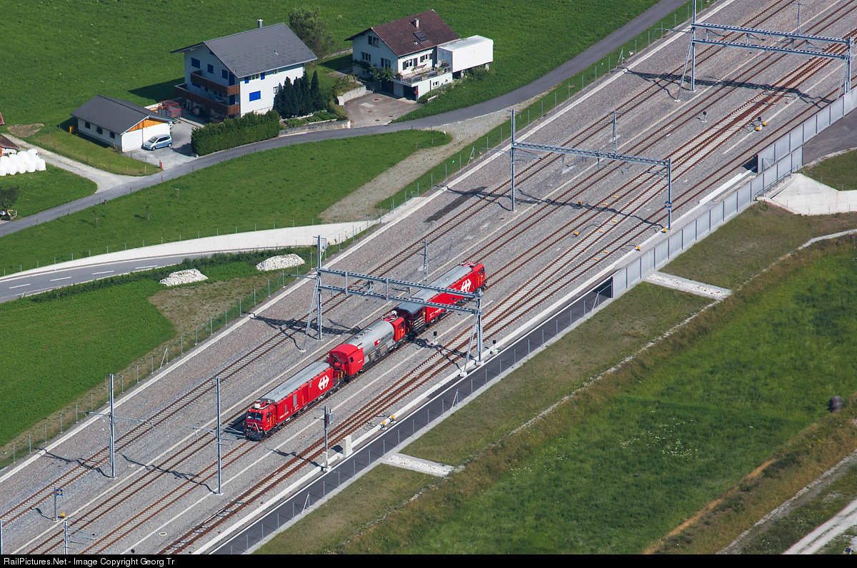 | View down from the mountain on the 4 tracks at Rynächt going to the Gotthard. The outer tracks are coming from/going to the Gotthard mountain line (Erstfeld), the two tracks in the middle to the Gotthard Base Tunnel. The fire-fighting and rescue train "LRZ 08" XTmas # 9177 004 "Lausanne" (which is based in Erstfeld in the moment) is rolling southward. |