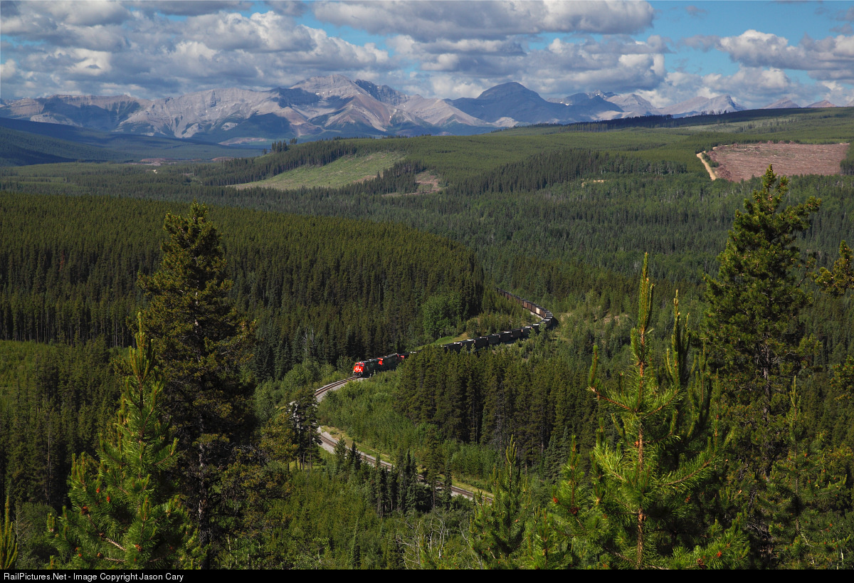 | The CN 2962 just throttled up to notch-8 about 10 cars before this photo was taken. The train is starting up the steep 1.25% grade with 50 cars of coking coal from the Cardinal River Mine. Jasper National Park is on the not so distant horizon. There is a new logging operation on the right side of the photo.... |