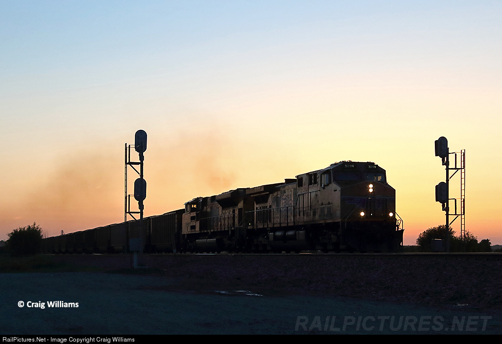 As the sun sets this eastbound coal train slams thru the control point at CPU 108, near Blairstown in central Iowa. This PRB coal train is bound for unloading at the Oak Creek, WI, plant for Wisconsin Electric Power.