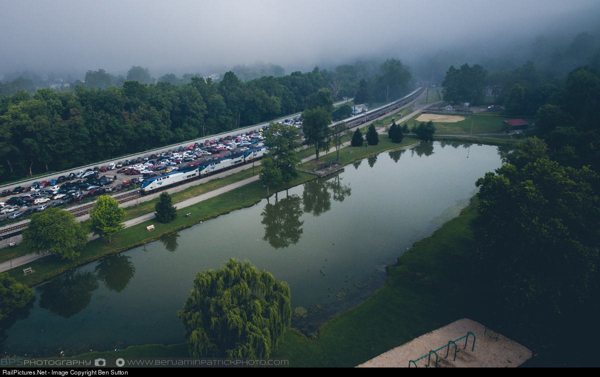 | A late P030, the Eastbound Capitol Limited, makes its way past Goehring Park in West Newton, PA. |