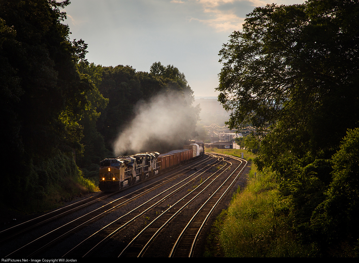 The afternoon sun glints off the rails of Norfolk Southern's Greenville to Atlanta mainline, the Greenville District, as northbound manifest 118 thunders into Seneca, SC blowing some smoke with an old Union Pacific AC4400CW leading the train to Linwood.