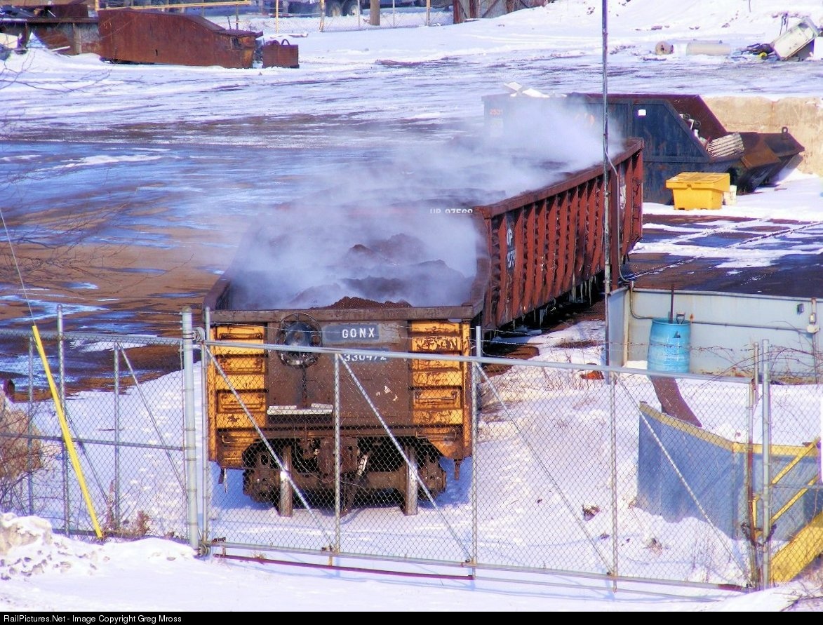 Taconite pellets are not the only thing that steam in the winter as these gondolas full of hot metal shavings show in March of 2014. The Gons are in a scrapyard in Racine, one of the few industries to still get cars in this once thriving city.