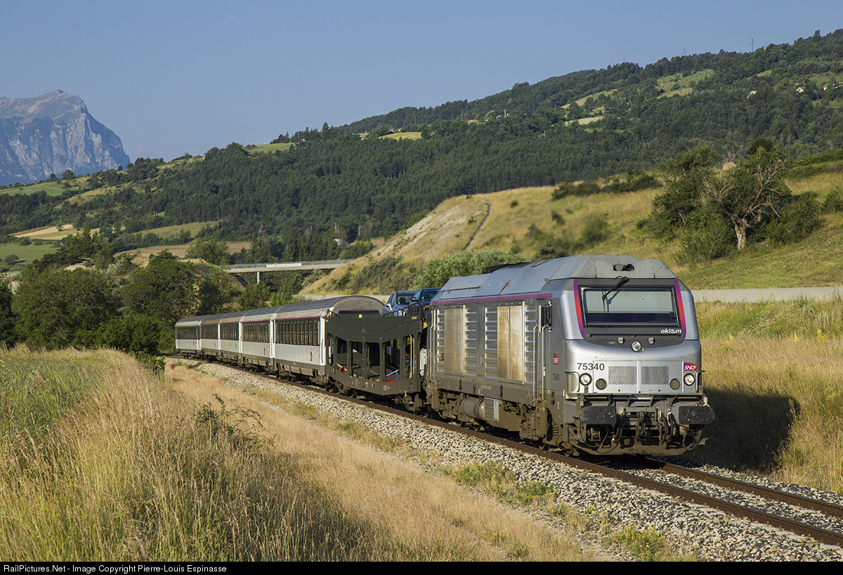 Overnight train from Paris Austerlitz to Briançon in the french alps is hauled by the new diesel locomotive BB 75300. The train has one vehicle in front for loading cars and motorbikes, followed by sleepers coaches.