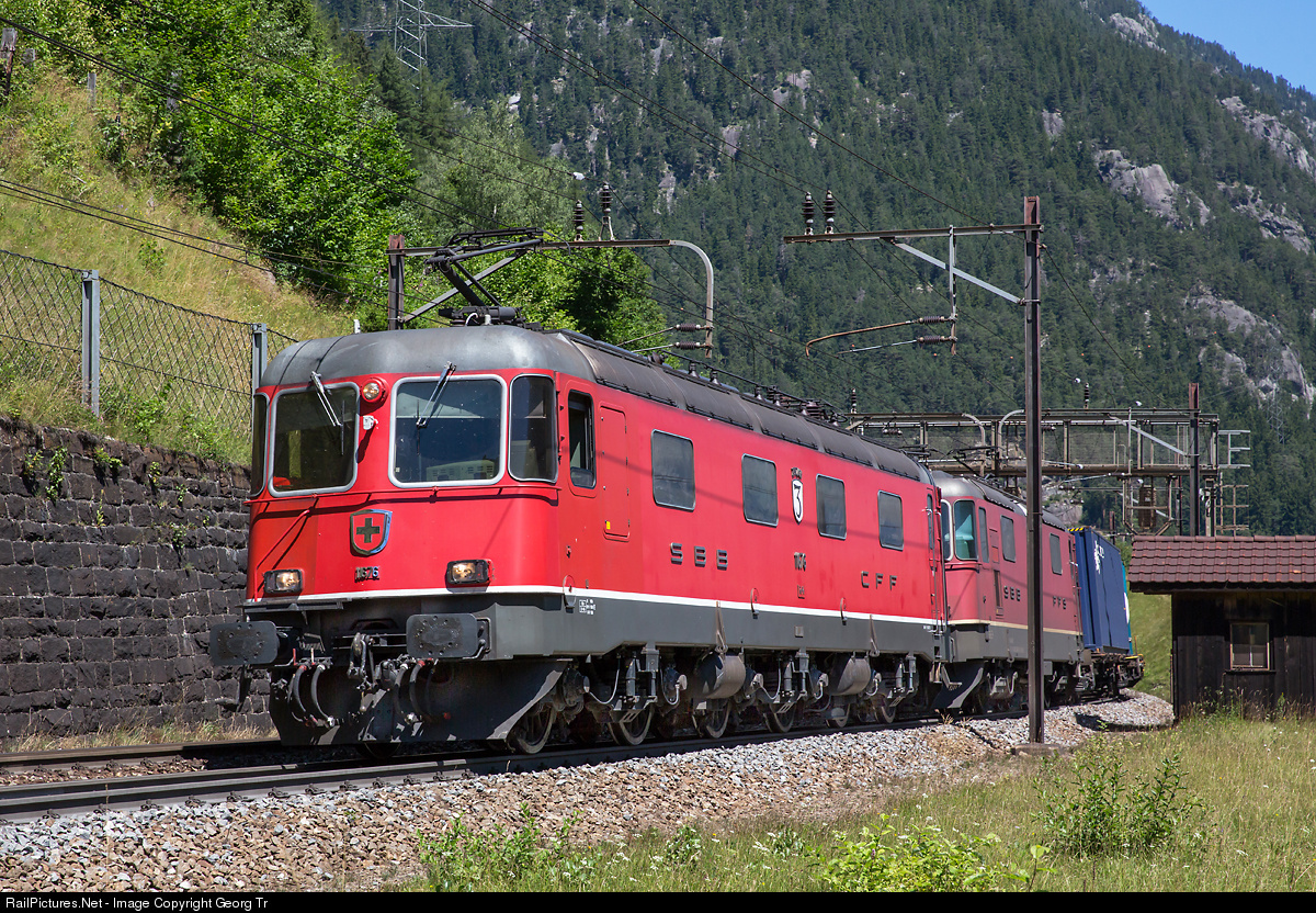 | Re 6/6 # 11676 "Zurzach" is probably the best kept of the series and a welcome sight. She is pulling a southbound freight, together with a Re 4/4 II, on the uppermost level at Wassen. |