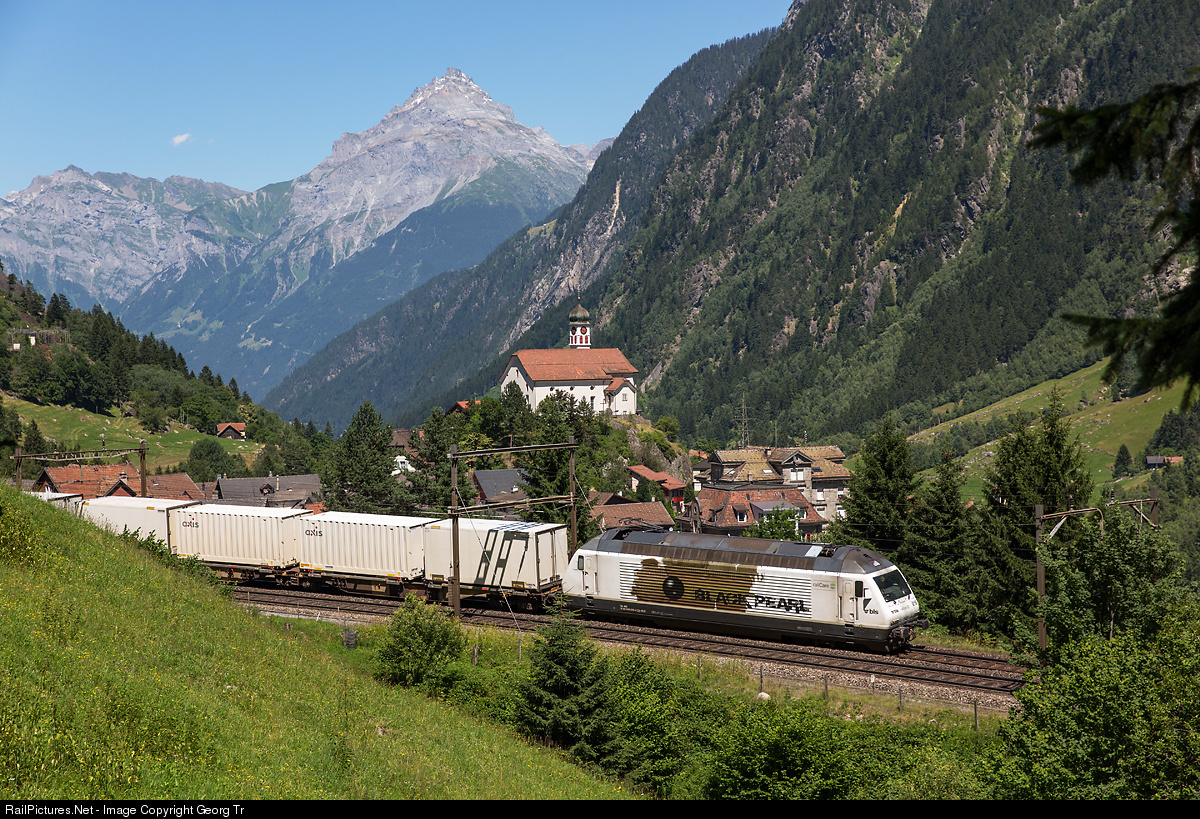 | Railcare train 50512 from Chiasso to Oensingen with the rented Re 465 # 016 "BLACK PEARL of the BLS running on the middle level at Wassen, with the baroque church and the Chli Windgällen mountain in the background. |