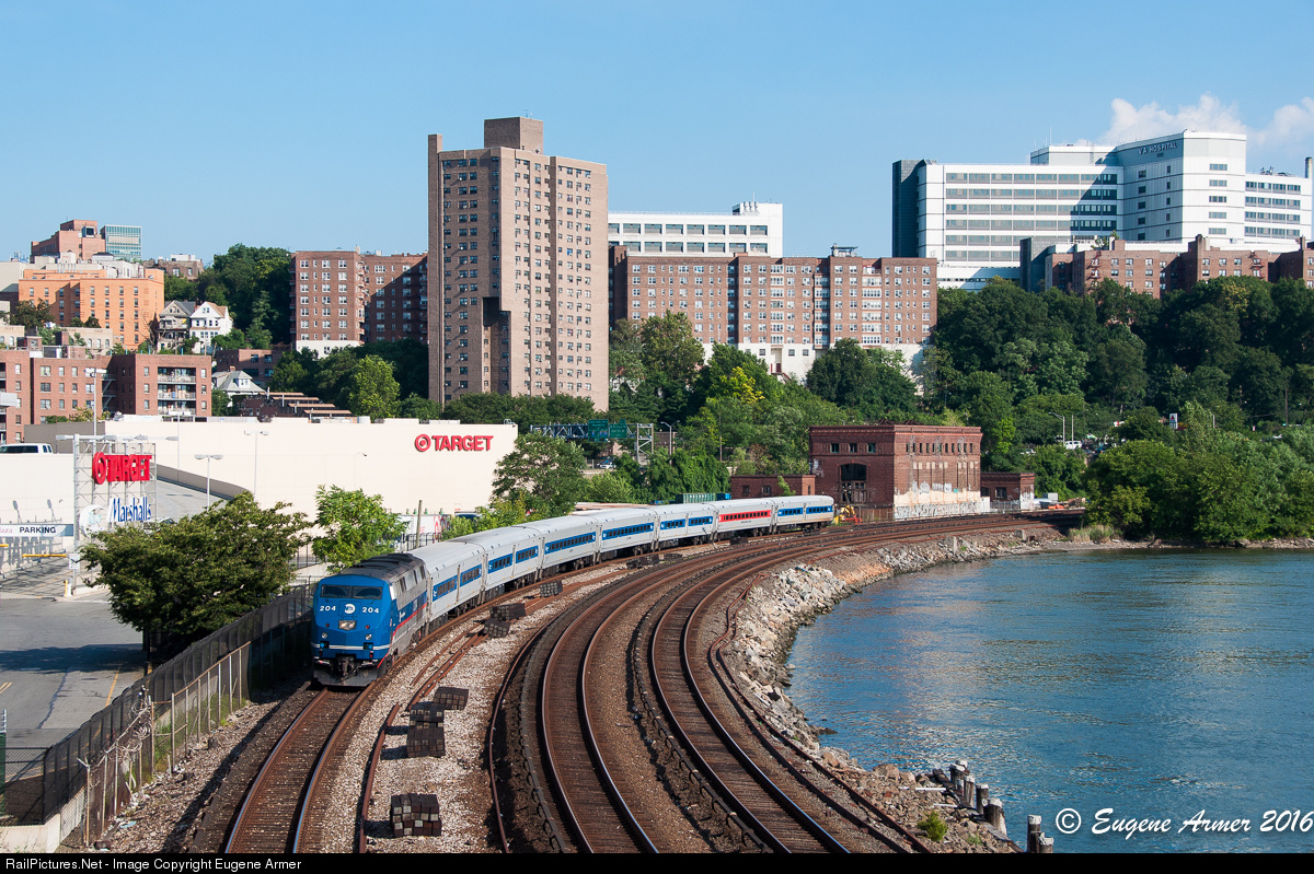 | It's a beautiful summer Sunday as Metro North's 5:14pm departure from Grand Central Terminal to Poughkeepsie is seen running along the Harlem River, approaching Marble Hill in the Bronx. The big white building top right is the James J. Peters VA Medical Center. Does anyone know the history of the building alongside the tracks at the rear of the train? |