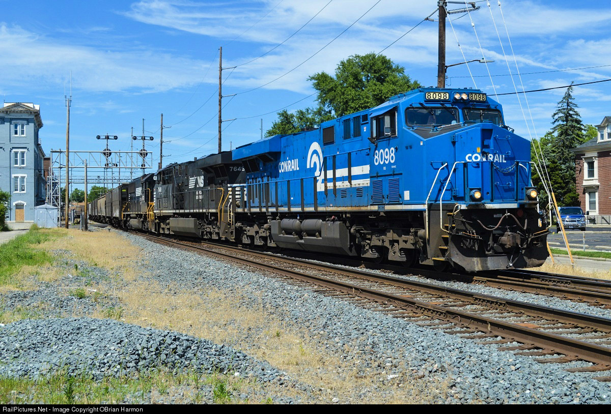 The Conrail heritage unit teams up with an SD60 and an ES40DC to pull this North Carolina bound grain train, through the Butler street interlocking, shortly after lunchtime.