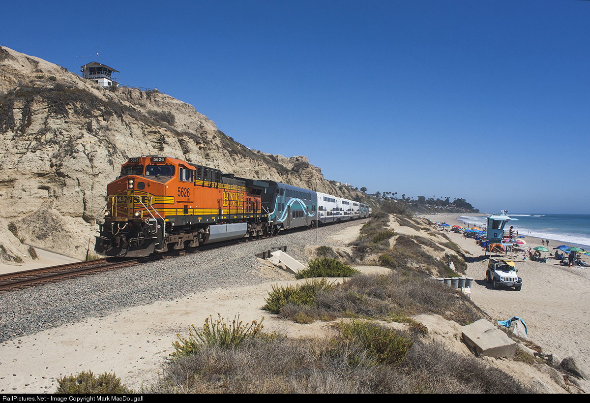 | A BNSF AC4400 brings Metrolink's Oceanside-Fullerton train 641 up the Orange Sub and passed beachgoers on a scorching hot July afternoon at San Clemente. Primary built for coal service, the 40 units leased for commuter trains are on what's probably the most unusual assignment that this class of locomotives has received. |