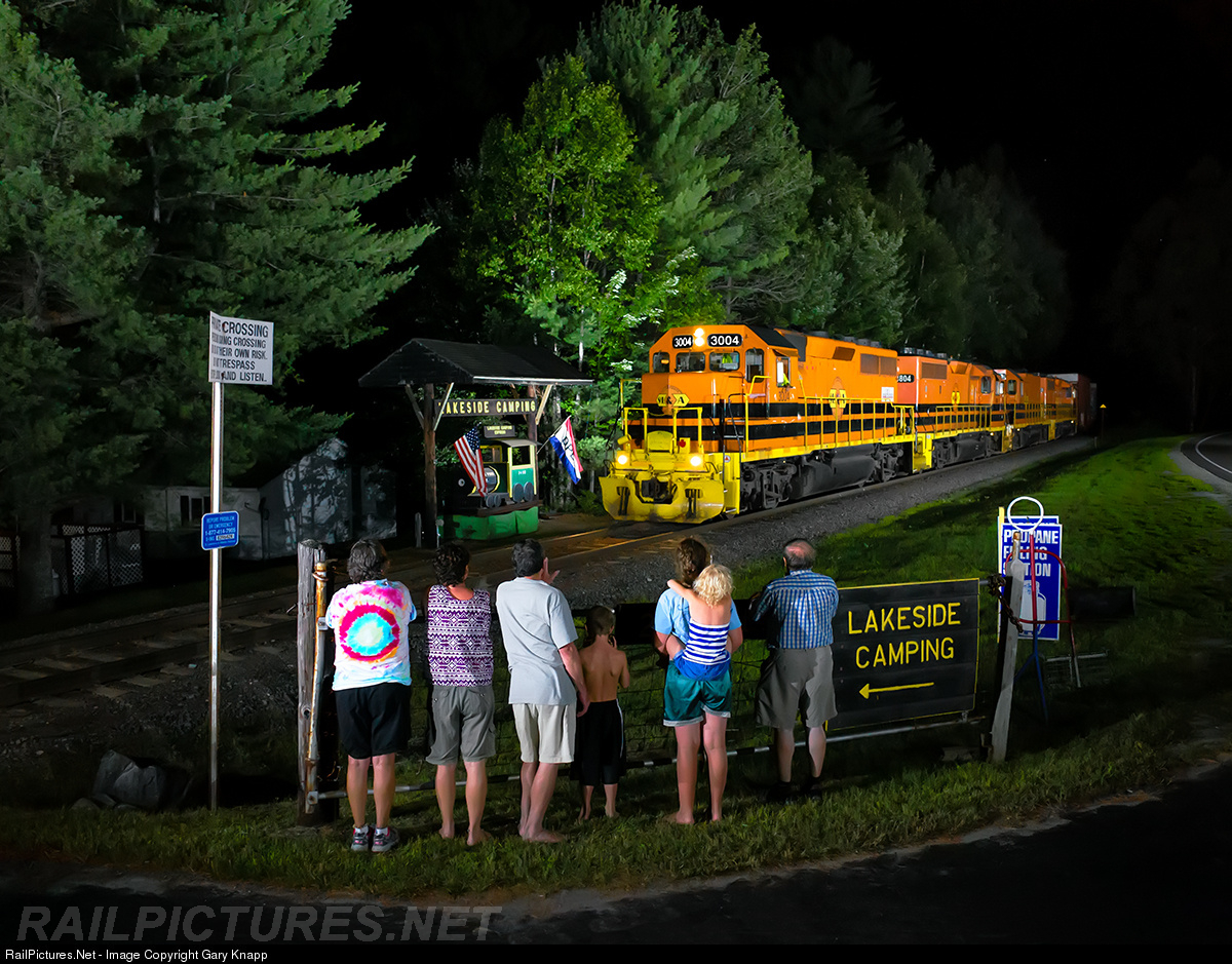 A timeless scene in Island Pond is lit up as SLR train 394 begins its overnight journey to Berlin, NH powered by three GP 40-2s and a Road Slug. Upon departing from the small yard the crew passes admiring campers outside Lakeside Camping at 22:31