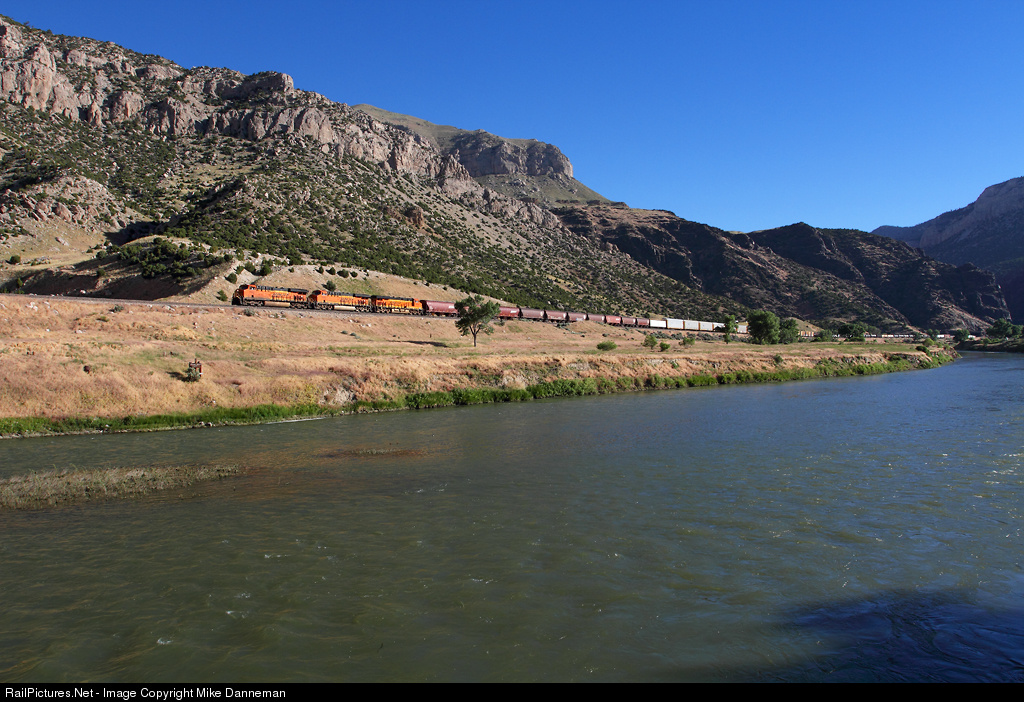 A southbound BNSF manifest freight passes through scenic Wind River Canyon between Dornick and Piper, Wyoming, on June 22, 2016, in a view is from our campsite at the Upper Wind River Campground. The train will soon cross the river and enter the 7,131-foot Boysen Tunnel.