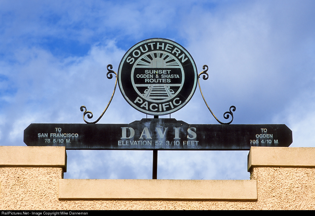 The classy Southern Pacific sign on the Davis, California, Amtrak station gives accurate milage to San Francisco and Ogden, as well as elevation in fractions of a foot!