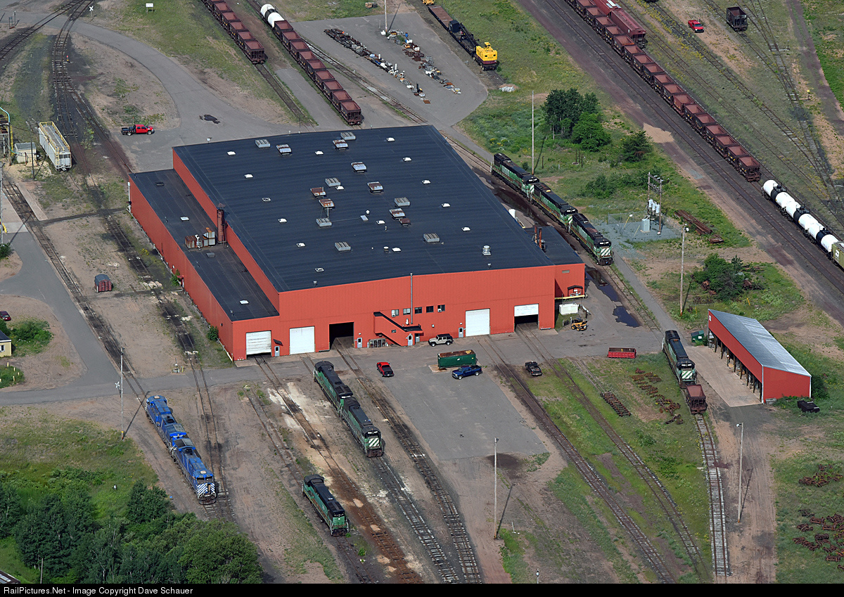 Looking more like Alliance, Nebraska in the late 1970s versus Upper Michigan in 2016, BN green dominates this view of LS&I's engine and car shop. From left to right are leased CEFX 1001/1012 (active), 3003 (missing its center wheel set on both trucks), 3000/3074 (active), 3011, 3006, 3053 and 3004, all stored. Also note a former Erie Mining (LTVSMC) locomotive crane at the top. I also noticed a large hopper used for diesel sand storage in the upper left, replacing two older black ones used here for many years. Cessna 172 Skyhawk.