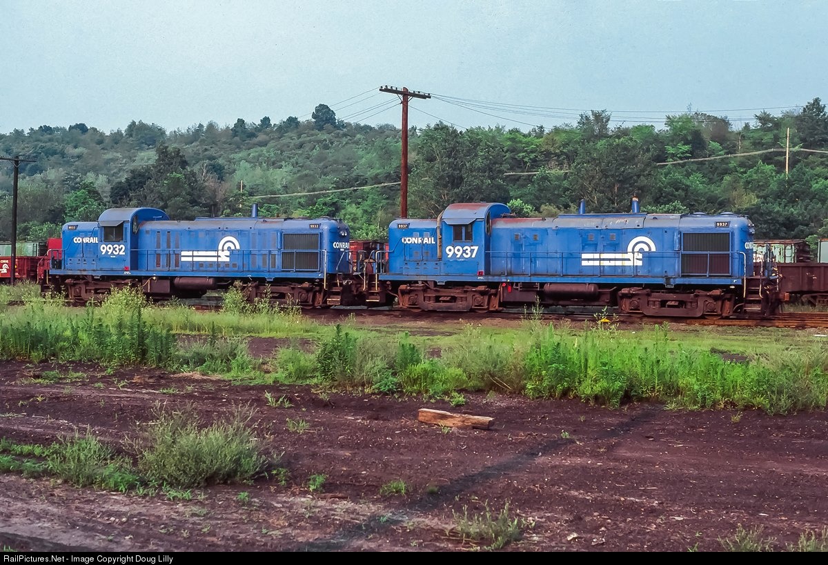 A first glance at this pair would suggest that two Conrail blue Alco RS3’s are in the yard at Altoona. Considering that, to the best of my knowledge, no unaltered RS3’s received a Conrail blue repaint, the impression would be incorrect. Under the long hoods of these units was an EMD 567 engine made surplus by the retirement of dozens of E units, which each had two of the V12’s. Started by the Penn Central at DeWitt, New York, the RS3 re-engine program was continued by Conrail and performed at the Juniata shops. Just shy of one hundred of these “DeWitt Geeps” were produced between 1972 and 1979. Conrail 9937 and 9932 began life as CNJ 1548 and Erie 1019, respectively.