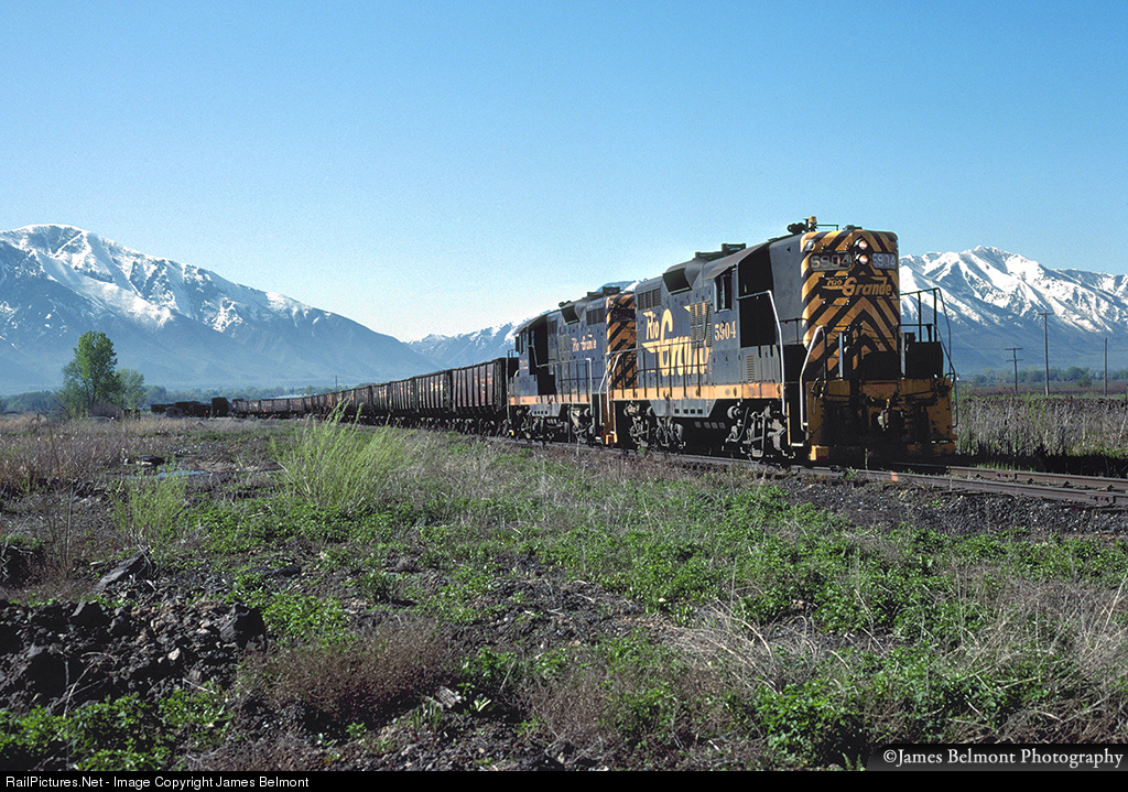 Rio Grande GP9s No. 5904 and 5922 set out a long cut of drop bottom gondolas in the former Columbia Steel Co. yard at Ironton on May 21, 1983. Spanish Fork Canyon, where a giant mudslide shut down the D&RGW mainline, blocked the river, and Highway 6 four weeks earlier is in the background above the first and second gondola cars.