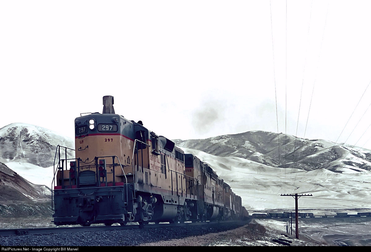 On the last day of April, 1967, a spring blizzard is closing in as the PVSC, UP’s daily Provo-Salt Lake City local, eases down the hill behind GP9 297 and a string of motive power worthy of a mainline freight. Within a few hours the snow here will be ankle-deep. Filling out today’s consist are cars of lumber and natural gas and loads of coil steel from the Geneva works at nearby Vineyard. The tall stack on the 297 indicates it is one of five 1954-built geeps equipped with steam generators and 800-gallon water tanks for use in local passenger trains, but by the mid-60s reassigned to freight service. UP will eventually reroute Provo-Salt Lake traffic to the nearby Rio Grande mainline, and Utah’s FrontRunner commuter line will follow the original UP alignment for the 48-mile journey to Salt Lake City.